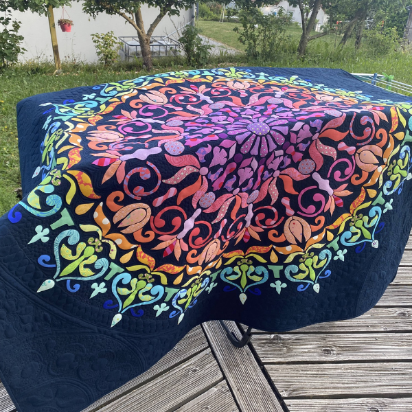 Il est quilté entièrement en piqué libre avec 8 fils de couleurs différentes assorties aux couleurs des appliqués.