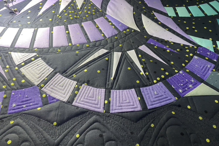 Il est quilté en free motion, avec les règles mais également avec des motifs réalisés sur ProStitcher designer