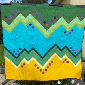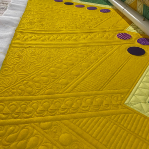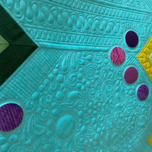 Quilter ce modèle a été un vrai moment de bonheur. J’ai choisi de conserver un maximum le quilting original. Cela m’a permis de mélanger à la fois du piqué libre dans la zone bleue central, de tester de nouveaux motifs, beaucoup de travail de règles et un peu de motifs programmés pour le tour des grands ronds appliqué et des petites series de ronds.